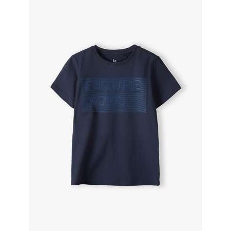Темно-синяя футболка для мальчика изготовлена из высококачественного приятного на ощупь хлопка. Футболка имеет круглый вырез горловины, свободный крой, короткие рукава и украшена дизайнерским принтом.