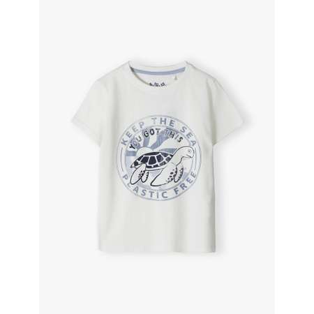 Футболка для мальчика молочного цвета выполнена из качественного хлопкового трикотажа, мягкого и приятного на ощупь, не раздражает чувствительную кожу ребенка. Имеет круглый вырез горловины, свободный крой, короткие рукава. Футболка украшена оригинальным принтом в виде черепахи. Благодаря качественному материалу и грамотному крою, изделие максимально комфортно для ребенка. Футболка отлично сочетается с шортами, джинсами, спортивными штанами и брюками.