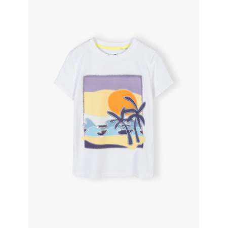 Футболка для мальчика белого цвета выполнена из качественного хлопкового трикотажа, мягкого и приятного на ощупь, не раздражает чувствительную кожу ребенка. Имеет круглый вырез горловины, свободный крой, короткие рукава. Футболка украшена принтом на летнюю тематику. Благодаря качественному материалу и грамотному крою, изделие максимально комфортно для ребенка.