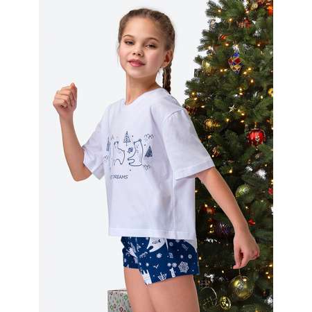Новогодняя пижама для девочки подростка выполнена из 100% хлопковой трикотажной ткани. В наборе укороченная футболка со спущенным плечом и шортики прямого кроя, пояс на эластичной резинке. Украшает принт медведи и ёлки.