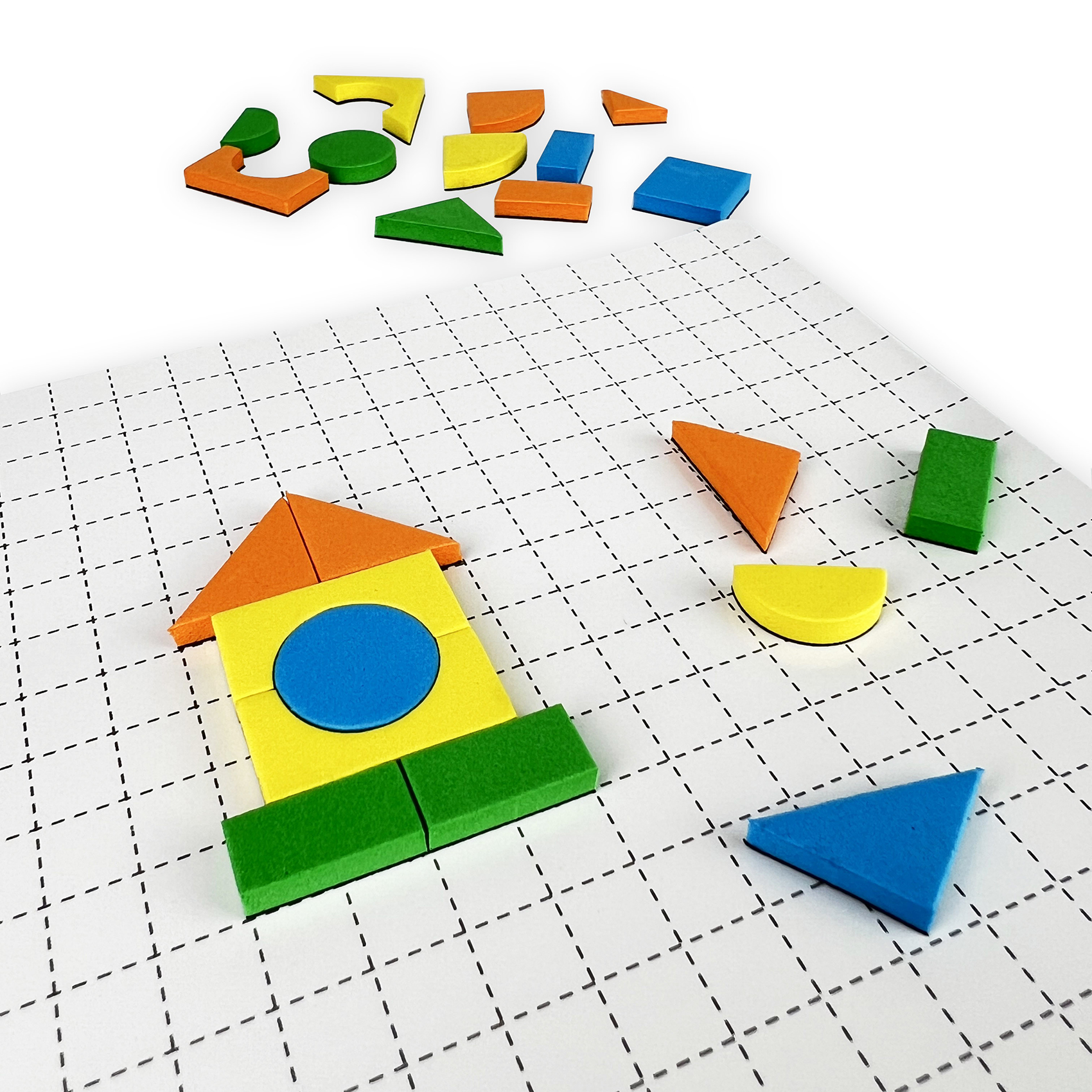 В комплекте: двустороннее игровое поле 17х21 см, 245 объёмных деталей на магнитной основе (геометрические 4 цветов: голубой, зелёный, жёлтый, оранжевый, (размеры от 1х1 см до 3х5 см) и дополнительные (размеры от 1х2 см до 4х5 см), 21 листовка 17х21 см с образцами картинок для сборки