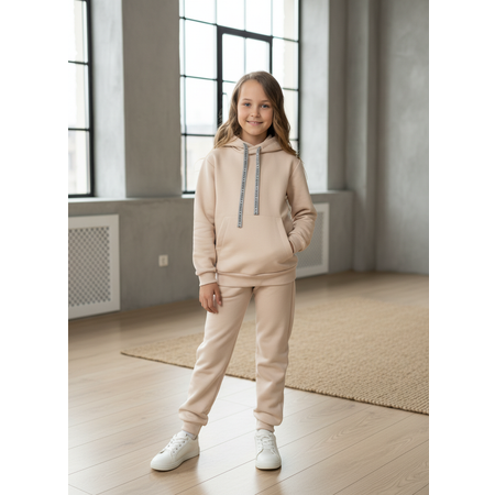 - Для повседневной носки; для занятий спортом; для прогулок на улице; в прохладное время года; костюм для детей; спортивная одежда. Бежевый костюм для девочки. Свойства ткани: Плотный, эластичный, гладкий на внешней стороне трикотаж с мягким внутренним начёсом.
