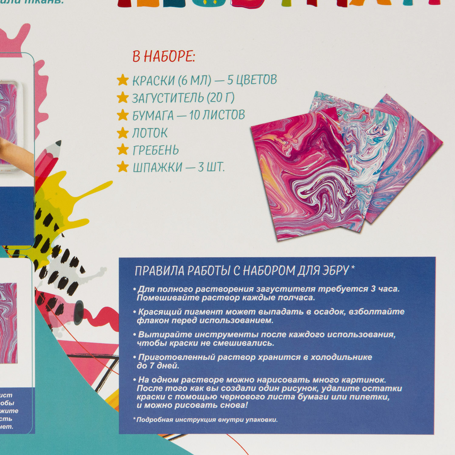Занятия с набором для рисования на воде «Эбру» развивают творческие способности ребёнка, воображение, тренируют аккуратность, внимательность, учат следовать инструкциям для достижения желаемого результата.