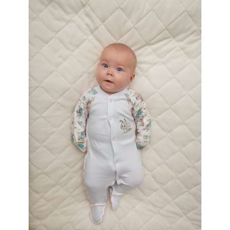 Комбинезон с закрытыми ручками для новорожденного сшит из интерлока швами наружу с отделкой "краше" с симпатичным принтом.