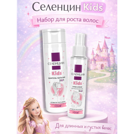 Набор для волос Селенцин KIDS активатор роста включает в себя: детский шампунь для волос для девочек и для подростков. Специально разработанный для детей от трёх лет Шампунь + Бальзам 2в1 способствует активации роста волос, улучшает питание волосяных фолликулов и увеличивает густоту. Шампунь детский для девочек бережно и эффективно очищает кожу головы. Шампунь + Бальзам кондиционер 2 в 1 создан на основе растительных моющих компонентов, которые деликатно ухаживают за волосами, не раздражая чувствительную кожу головы. Детские косметические средства для роста волос Селенцин основаны на растительном активном ингредиенте Seveov – это специализированный запатентованный комплекс от компании Naturex (Франция). Экстракт перуанской маки регулирует жизненный цикл фолликулов. Ниацинамид (Витамин B3) — препятствует затвердеванию коллагена вокруг волосяной луковицы, предотвращает выпадение волос, продлевая их жизненный цикл. Органический сок алоэ — питает волосяную луковицу, укрепляет корни волос, останавливает выпадение и улучшает прочность стержня волоса. При регулярном использовании шампунь для роста волос Селенцин сделает детские волосы сильными, упругими, гладкими и блестящими и обеспечит легкое расчесывание для детей.