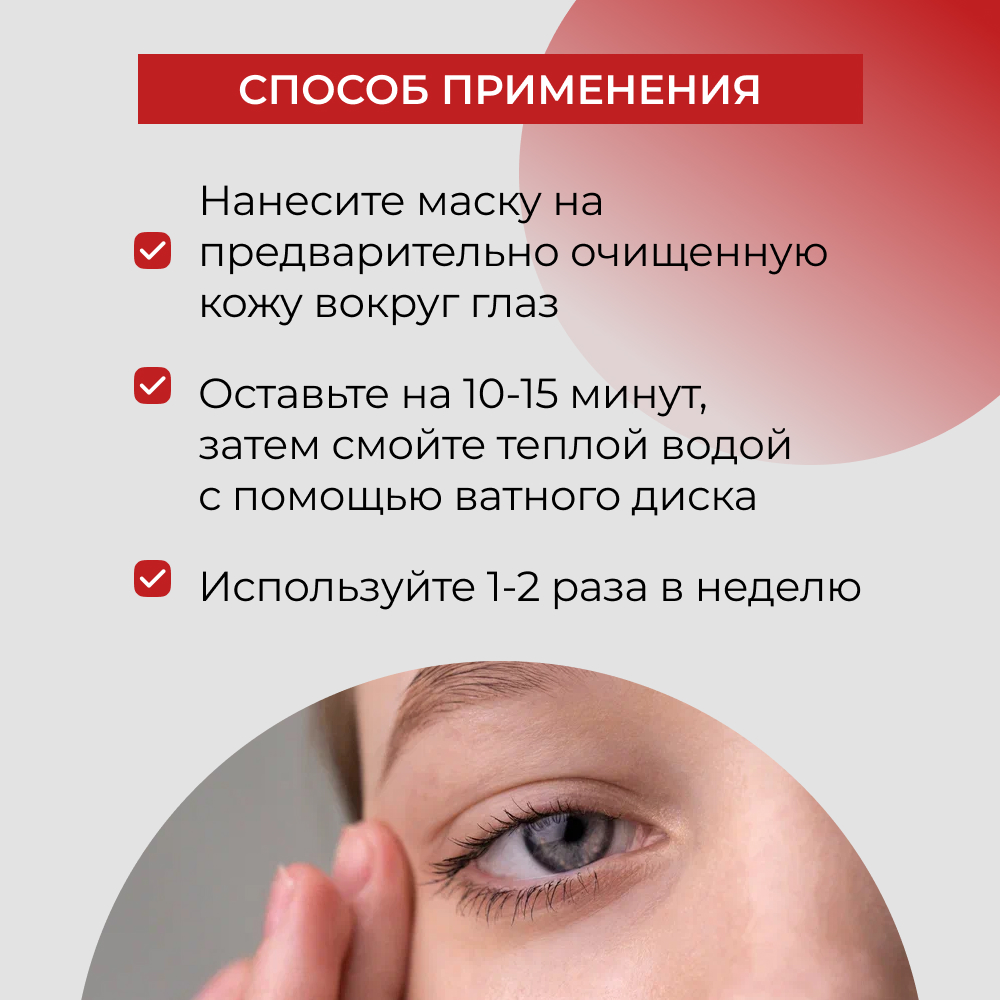 СПОСОБ ПРИМЕНЕНИЯ: перед первым использованием встряхните флакон и медленно нажмите на дозатор 15-20 раз. Нанесите маску на предварительно очищенную кожу вокруг глаз. Оставьте на 10-15 минут, затем смойте теплой водой с помощью ватного диска.