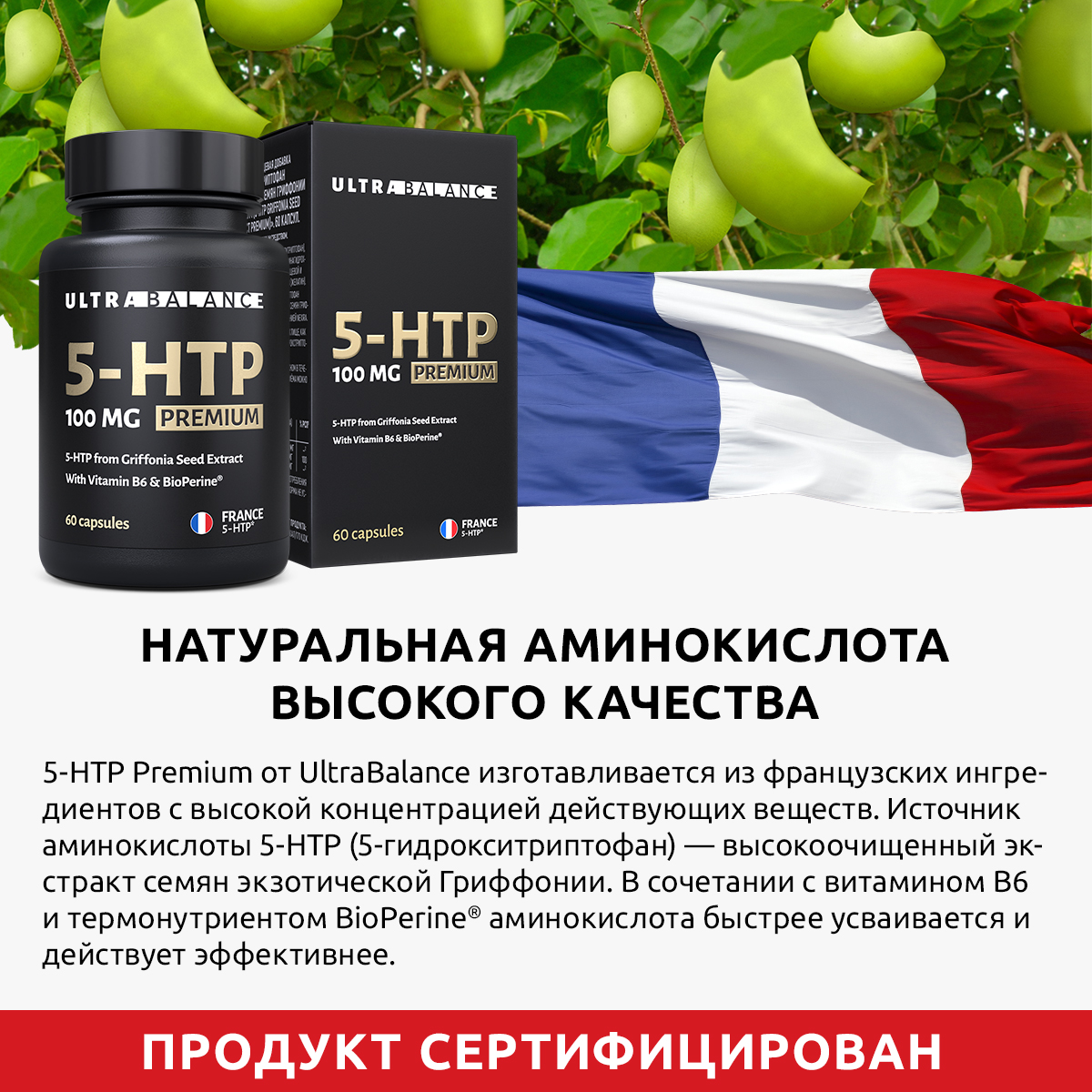 5-HTP 100 mg Premium от UltraBalance натуральная аминокислота высокого качества изготавливается из французских ингредиентов с высокой концентрацией действующих веществ. Источник аминокислоты 5-НТР (5 - гидрокситриптофан) - высокоочищенный экстракт семян экзотической Гриффонии. В сочетании с витамином В6 и BioPerine аминокислота усваивается и действует эффективнее.