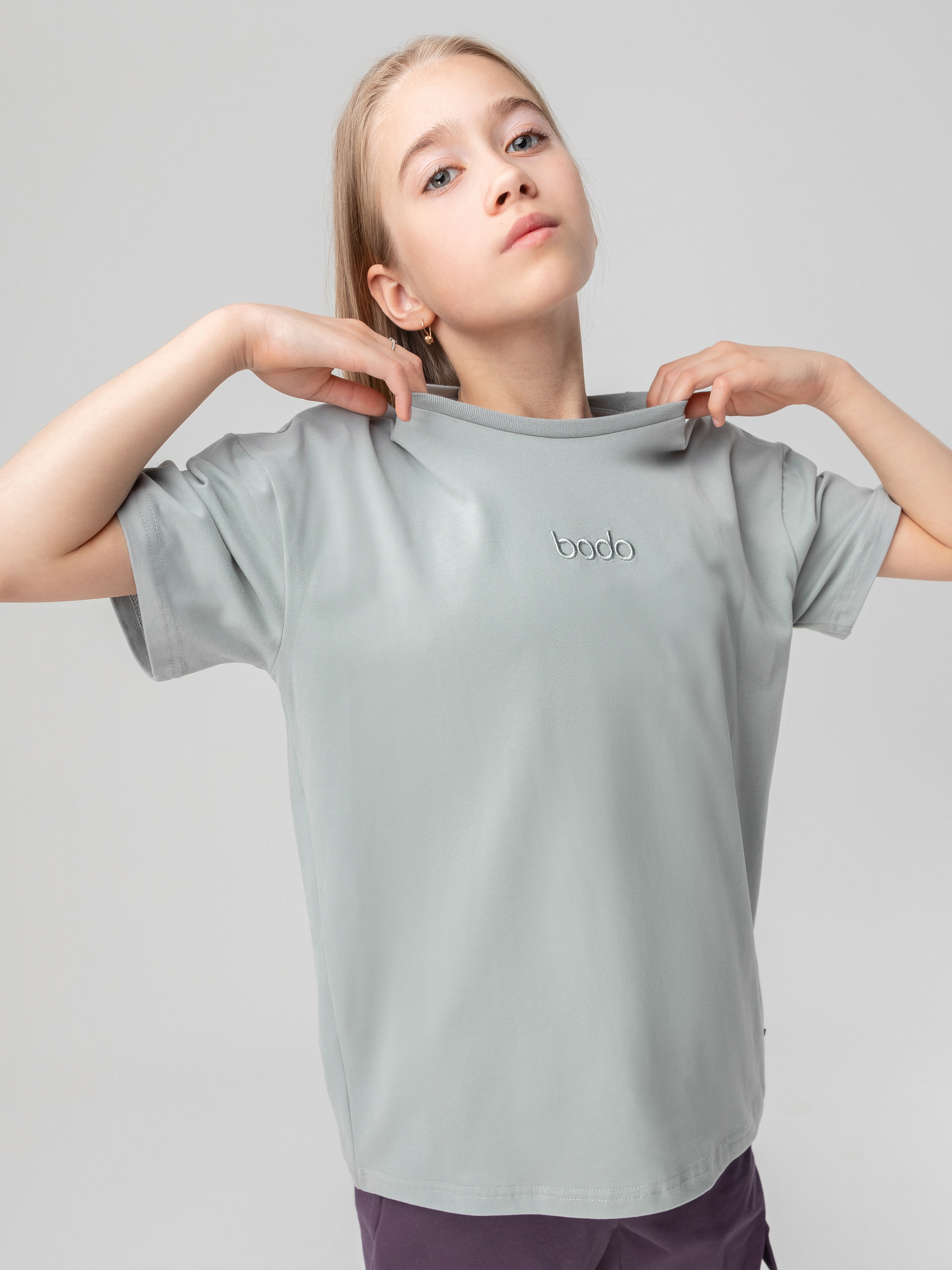 Футболка свободного, прямого силуэта с втачным коротким рукавом, горловина округлой формы.