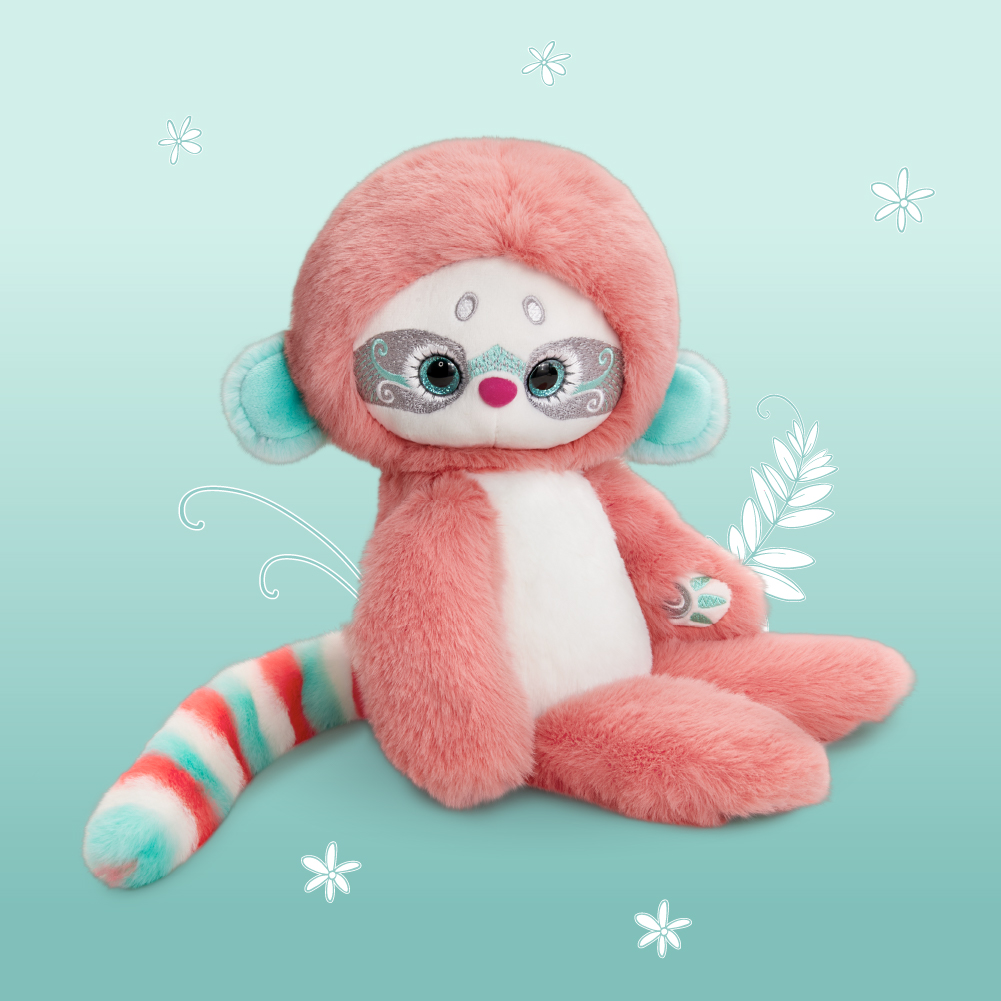 Сладкоежка Моммо похож на огромную круглую карамельку. Его шубка цвета персикового пунша с белыми прослойками и цвета бирюзовой пастели. Вокруг необычных мятных глаз вышита интересная маска с бирюзовыми и белыми завитками. А яркий носик готов унюхать сладости где угодно.