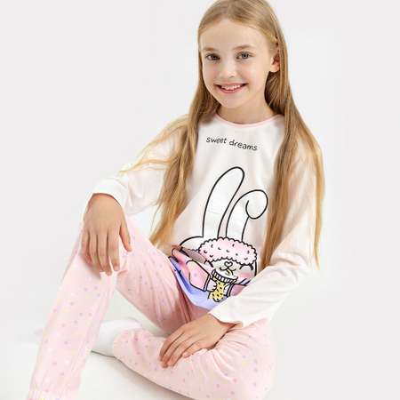 Пижама для девочки, выполнена из полотна кулирного переплетения и состоит из футболки с длинным рукавом и брюк. Горловина круглой формы из притачной обтачки. Обтачка из полотна рибана. Шов втачивания обтачки по спинке закрыт бейкой. Рукава короткие втачные. Низ майки обработан швом в подгибку. Брюки длинные, немного заужены к низу. Пояс цельнокроенный с эластичной тесьмой внутри. Низ брюк застрочен с эластичной тесьмой внутри.