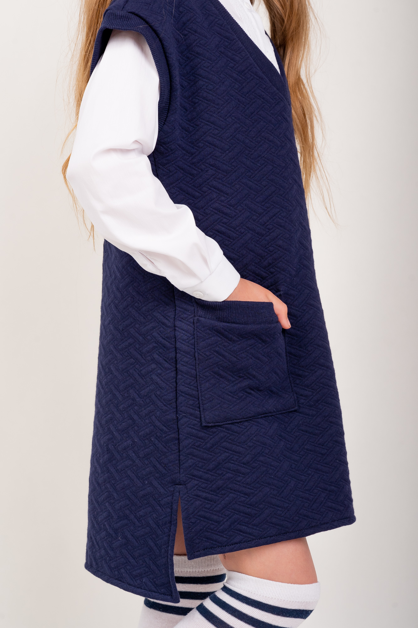 Сарафан из трикотажного хлопкового полотна капитоний. Прямого покроя. Длиной чуть выше колен. Низ ассиметричный полка выше спинки. По бокам разрезы. Плечо спущено. V- образный вырез горловины и проймы под планку. По переду большие накладные карманы украшенные металлической нашивкой.