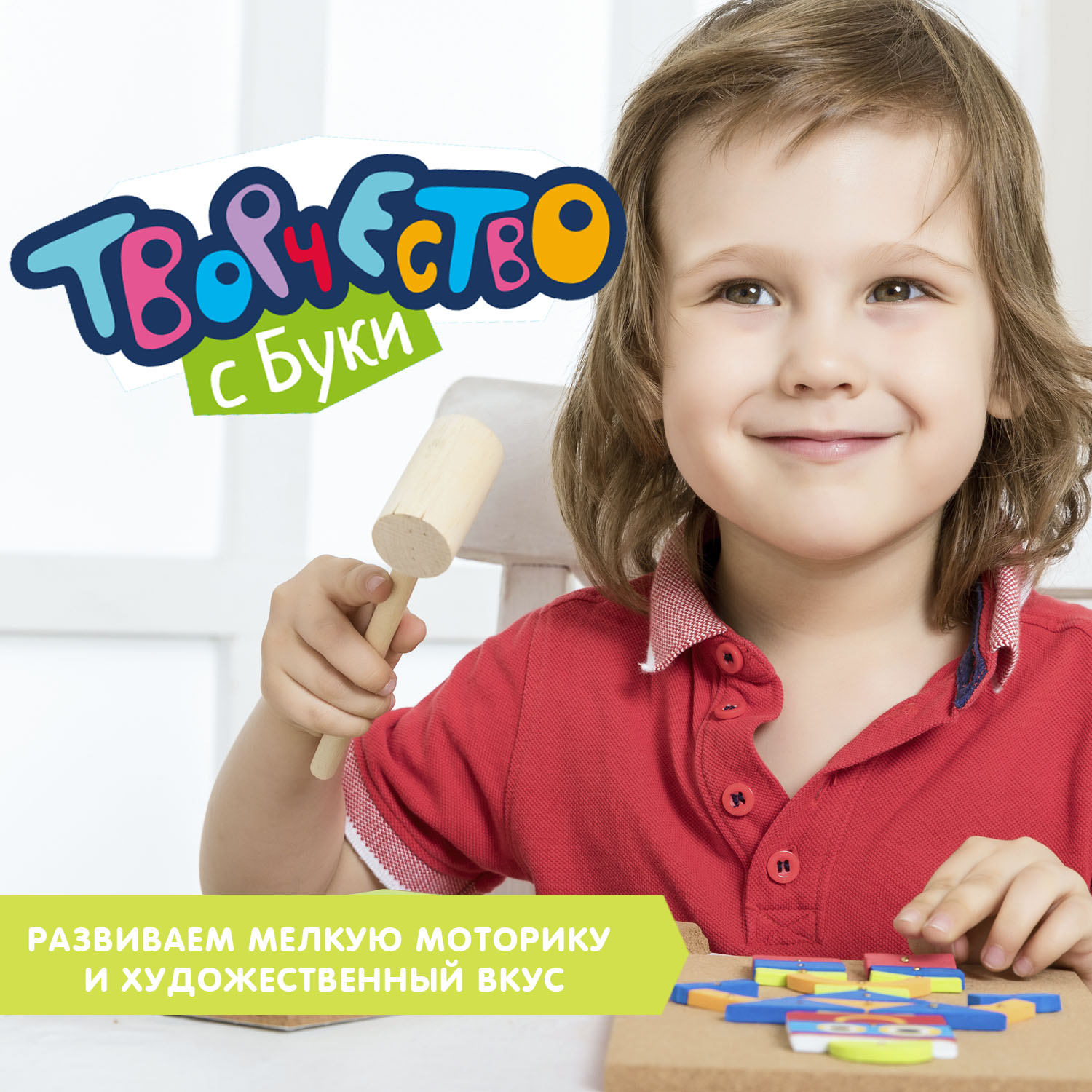 Выберите один из трех сюжетов сборки или пофантазируйте. Разложите мягкие детали из безопасного EVA разных форм, размеров, цветов на основе. Аккуратно прибейте их гвоздиками с помощью деревянного молоточка. Это очень просто и не требует особых усилий. Немного усердия и яркая картина с забавным роботом готова! А еще созданное изображение легко разобрать.