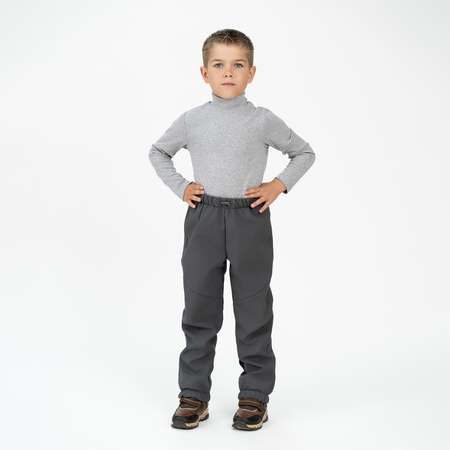 Спортивные брюки из современного полотна soft shell (мембранной ткани с флисовым изнаночным слоем). Изделие износостойко, не пропускает ветер и воду; имеет высокие дышащие свойства и небольшой вес. Брюки фиксируются на талии поясом со шнурком. На концах шнурка фиксаторы. Сшиты в однотонном цвете с принтом на боку. Брюки подходят для прогулок и занятий спортом в осенне-весенний сезон. Брюки для мальчика, брюки для девочки, демисезонные штаны.