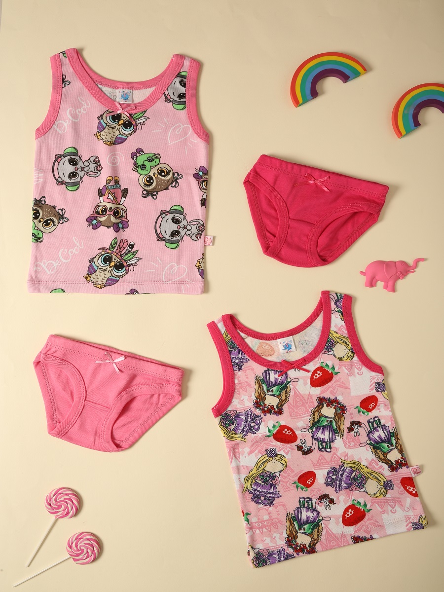 Наша коллекция предлагает множество ярких дизайнов. В наборе детского белья вы найдете двое трусов и две майки для девочки в стильных девичьих цветах. Любимые и стойкие принты - котики, облачка, сердечки очень понравятся девочкам. Наша детская одежда станет любимой у детей и будет радовать их своей оригинальностью.