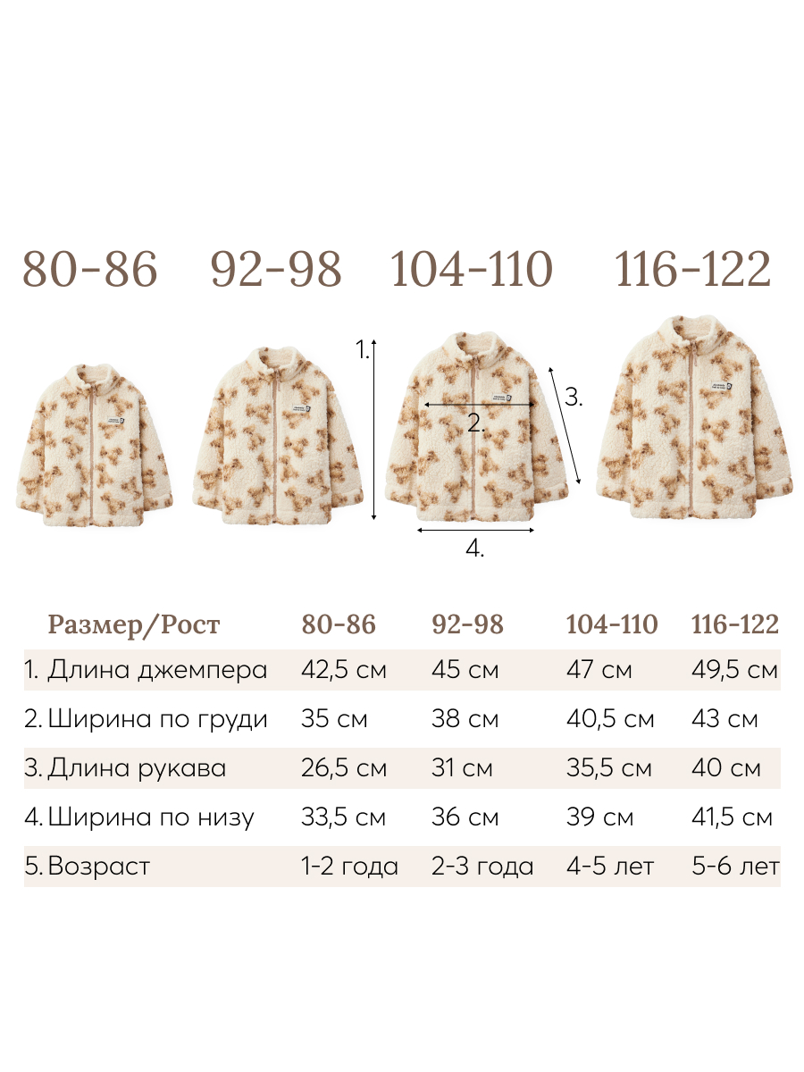 Детская флисовая куртка для девочки осень Happy Baby - идеальное решение для маленьких детей в холодные дни осени, зимы и весны . Куртка для мальчика демисезонная изготовлен на из мягкого, приятного на ощупь материала - флиса, эта осенняя модная кофта на молнии на девочку обеспечивает максимальный комфорт и тепло вашему ребенку. Плюшевая фактура вещей - это современный тренд в детской одежде, который будет актуален под любую ситуацию. Джемпер для мальчика подходит для повседневных походов в детский садик или для длительных зимних прогулок в качестве дополнительного слоя под верхнюю одежду при холодной погоде . Джемпер для девочки с универсальным дизайном подходит для всех детей. Куртка демисезонная для девочки с молнией на груди делает ее легкой и удобной в ношении. Высокий воротник, манжеты на рукавах и низ с эластичной резинкой обеспечивают идеальную посадку и защиту от проникновения холодного ветра. Ворот закрывает шею, так что ваш ребенок будет с защищенным горлом. Теплая детская толстовка для мальчика подходит для создания нарядных осенних и весенних образов для праздничных мероприятий, утренников в детском саду или новогодних выступлений. Свободная оверсайз толстовка для девочки не сковывает движений, что очень важно для активных детей. Стильная куртка демисезонная для мальчика доступна в однотонном исполнении (коричневом, белом и сером), с абстрактным красивым принтом и с милым рисунком мишек. Разнообразие расцветок куртки для девочек позволит ребенку выбрать стиль, который ему больше нравится. Кофта для девочки станет отличным дополнением к гардеробу ребенка и подойдет как для прогулок на свежем воздухе, так и для ношения дома в качестве домашней одежды. Независимо от того, куда собирается ваш ребенок, эта куртка осенняя для мальчика будет незаменимой частью его образа. В магазине нашего бренда Хеппи Беби Вы сможете найти другие предметы одежды, выполненные в едином стиле, и собрать ребенку полноценный комплект, докупив их отдельно. Размерная сетка рассчитана на рост 80 - 86, 92 - 98, 104 - 110 и 116 - 122 см. Что подходит под возраст 1 - 1,5, 2 - 3 года, 4 - 5 и 6 - 7 лет соответственно. Так что вы без проблем подберете размер, походящий именно вашему малышу.