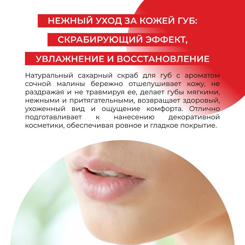 Натуральный сахарный скраб для губ с ароматом сочной малины бережно отшелушивает кожу, не раздражая и не травмируя ее, делает губы мягкими, нежными и притягательными, возвращает здоровый, ухоженный вид и ощущение комфорта. Отлично подготавливает к нанесению декоративной косметики, обеспечивая ровное и гладкое покрытие.