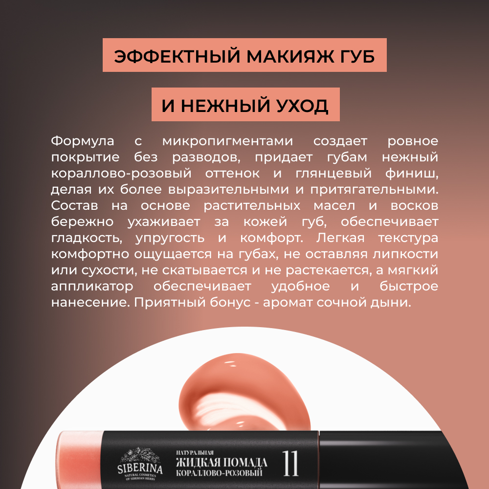 Цена на Помада для губ Siberina натуральная жидкая «Кораллово-розовый» 10 мл - 498 ₽.