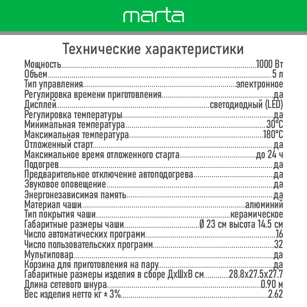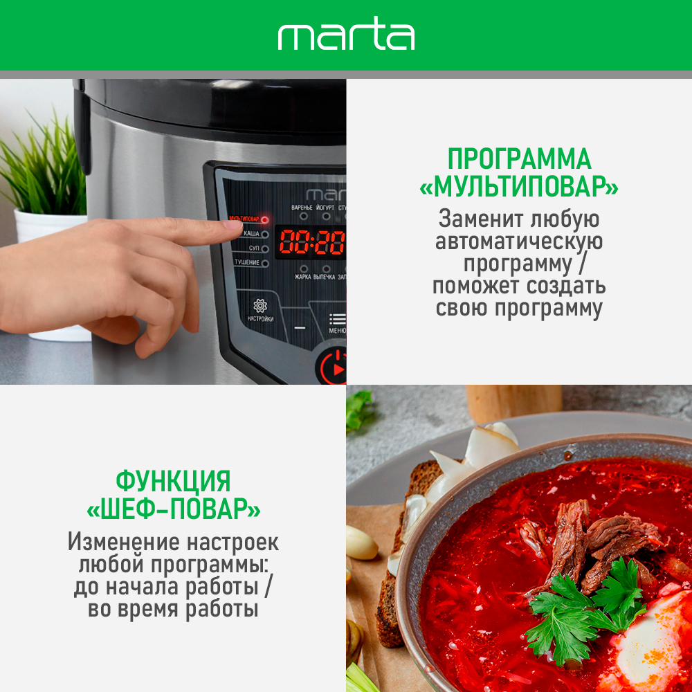 Компания MARTA представляет мультиварку MT-MC4335A – с полным набором основных функций и набором наиболее популярных программ. Мультиварка комплектуется чашей с антипригарным покрытием, снабжена крайне актуальными функциями "Шеф повар" и "Отмена автоподогрева". Яркий дисплей, видный при любом освещении и под любым углом. Программа МУЛЬТИПОВАР для полной свободы творчества!