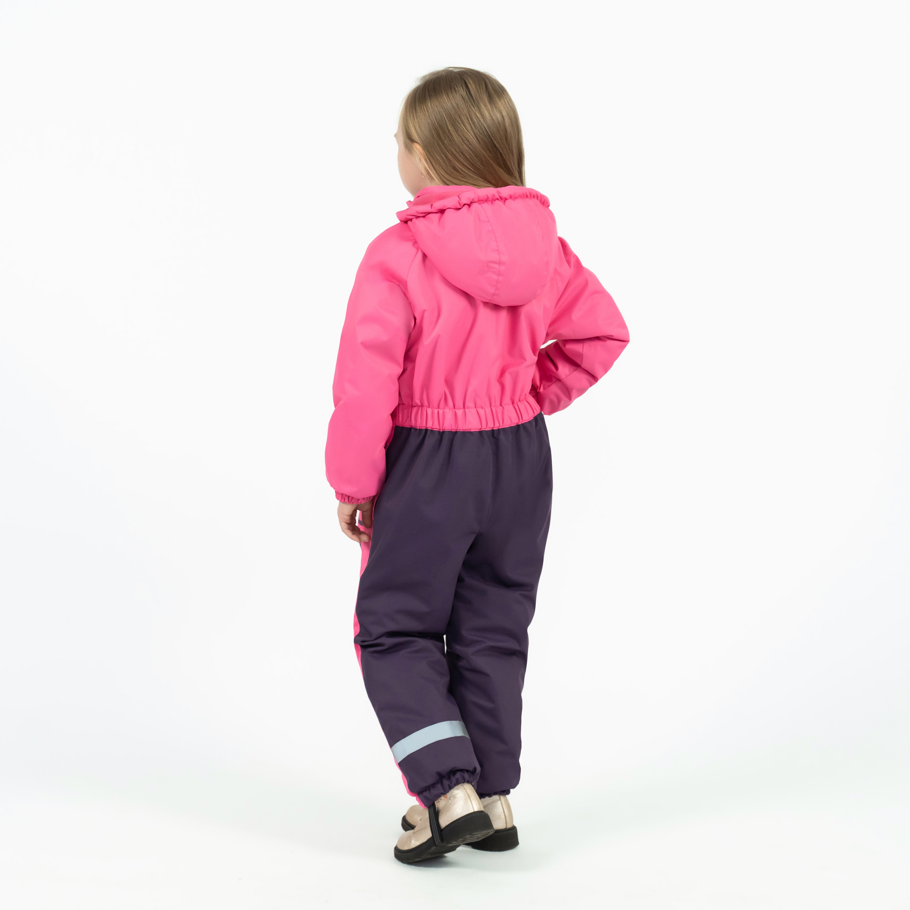 Особенности модели: Комфортный комбинезон для детей. Несъемный капюшон регулируется по размеру резинкой-утяжкой на фиксаторах. Рукава регланы с манжетами на флисовом подкладе и с резинкой. На штанинах эластичные штрипки и манжеты на резинке. Молния-застёжка уходит в ножку. На бегунке тканевый пуллер. Есть внутренняя ветрозащитная планка и чехол для бегунка. Карманы в боковых швах. Резинка на спинке в области поясницы. Небольшая светоотражающая нашивка спереди. Светоотражающая полоса на штанине сзади. Выпускается в сочетании двух цветов, спереди декоративные принты.
