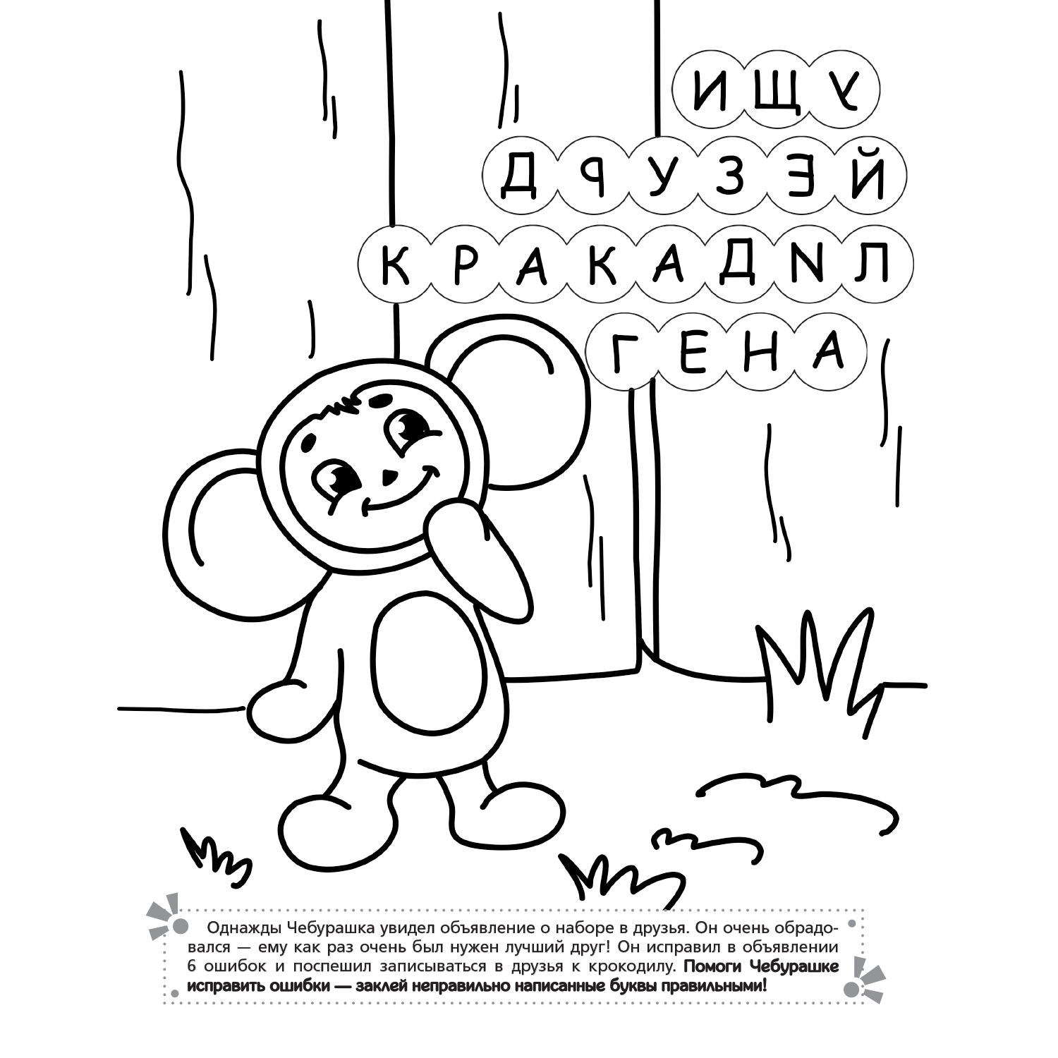 1! Раскрась Чебурашку и его друзей 2! послушай историю появления ушастого зверька и его дружбы с добрым крокодилом 3! поучаствуй в сказке — дополни картинку наклейками и помоги героям составлять слова из букв.
