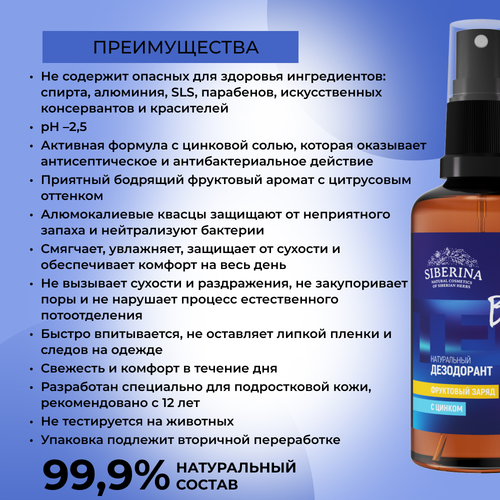 Цена на Дезодорант-спрей Siberina натуральный «Фруктовый заряд» с цинком для подростков 50 мл - 448 ₽.