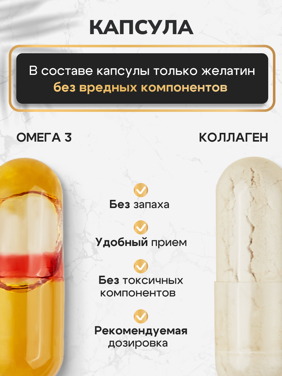 - Для тех кто не хочет мучаться с подбором вкуса и консистенции коллагена в порошке решение отличное. Омега тоже пьется комфортно но я всеравно после еды пью чтобы рыбу потом не чувствовать.
