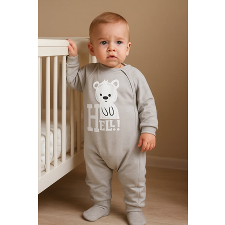Комбинезон для малыша выполнен из мягкого приятного к телу трикотажа. Модель с длинным рукавом, на ножках закрытый носочек, который дополнительно снабжен манжетой.