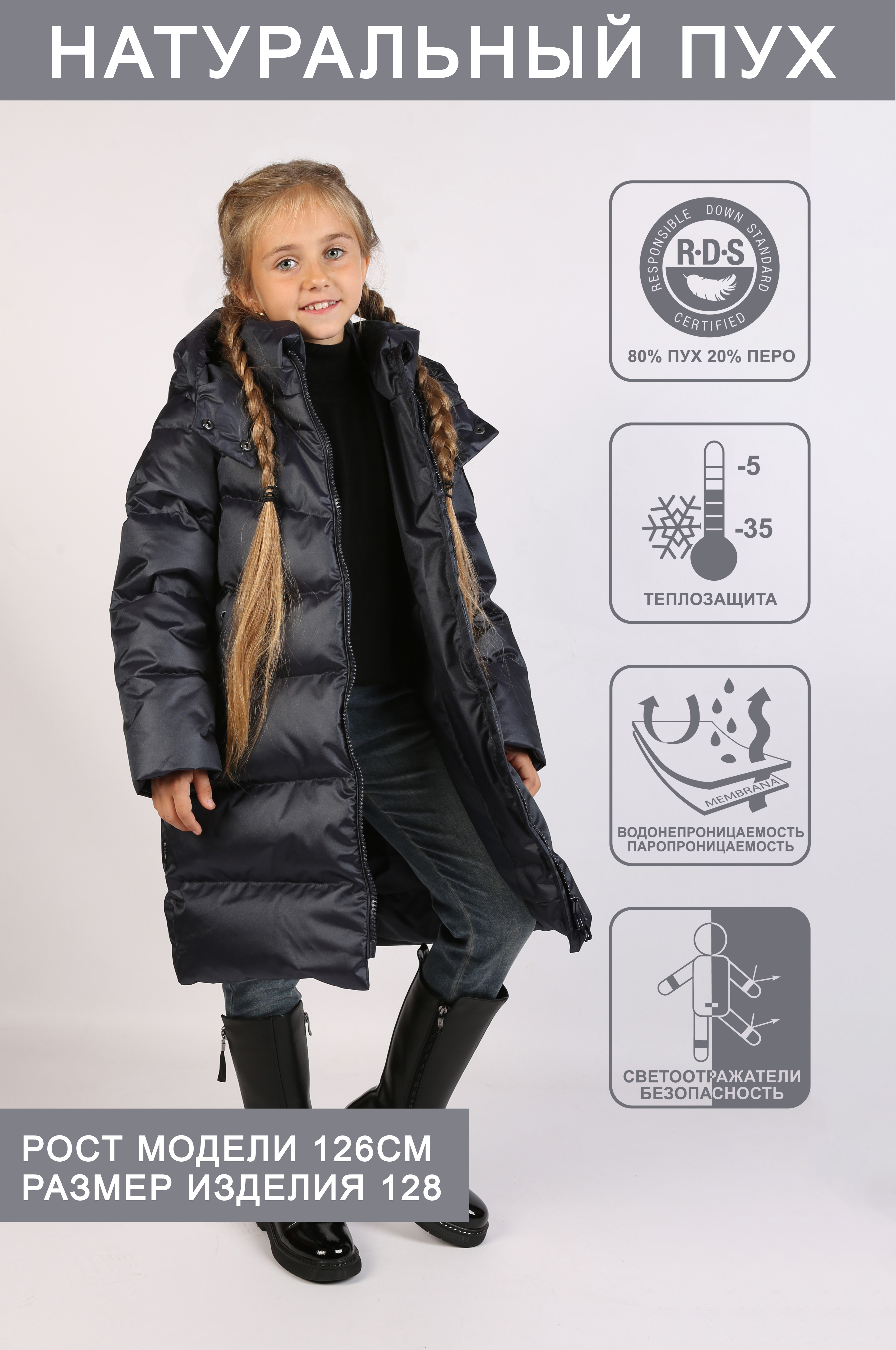 • На спинке пальто и в боковом шве элементы из свето-возвращающего материала для безопасности ребенка.