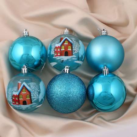 Набор шаров Зимнее волшебство пластик d-8 см 6 шт «Зимний домик» голубой