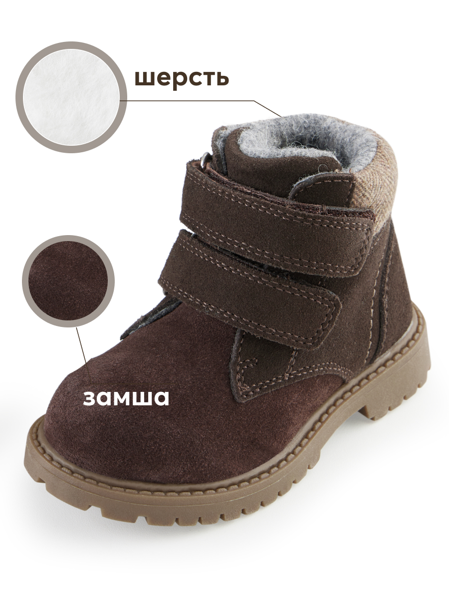 Ботинки для мальчика из замши просты в уходе и заботятся о комфорте детских ножек. Ботинки для девочки - легко сочетаются с демисезонной одеждой разных цветов. Натуральный материал хорошо облегает ногу, не сковывает движения, не деформируется. Внутри байковая шерстяная подкладка, которая сохраняет тепло, при этом не давая ноге вспотеть. Небольшой каблук, круглый нос, жесткая пятка, гибкая нескользящая подошва - благодаря этому ребенок не устанет от долгой ходьбы. Ботинки демисезонные для мальчика застегиваются на липучку: малыш сможет легко одеваться сам дома и в детском саду. Ботинки демисезонные для девочки просто чистить, они долго сохраняют презентабельный внешний вид.