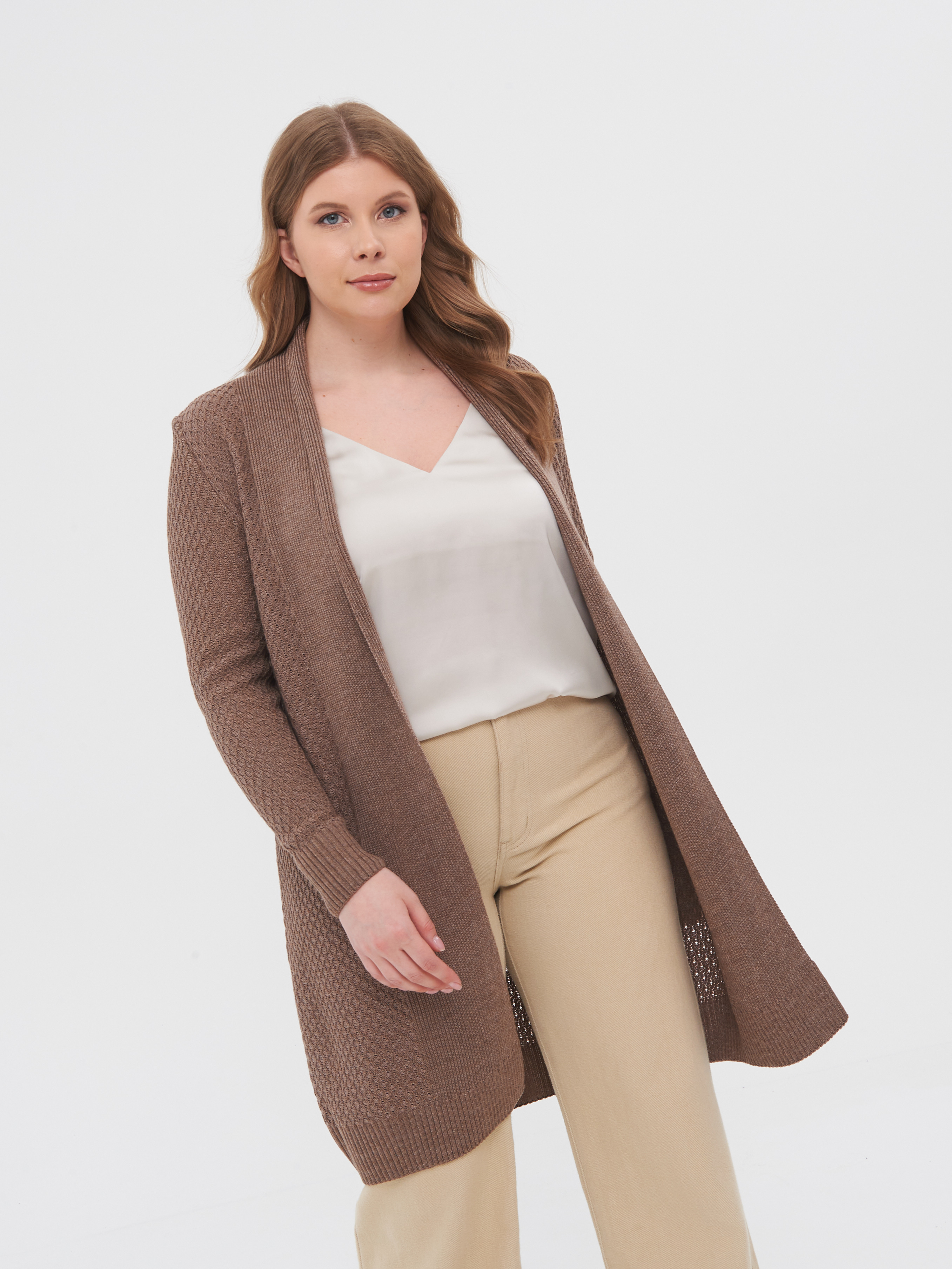 Кардиган женский вязанный свободного кроя, с длинными рукавами. Кардиган связан ажурной вязкой из хлопковой пряжи.