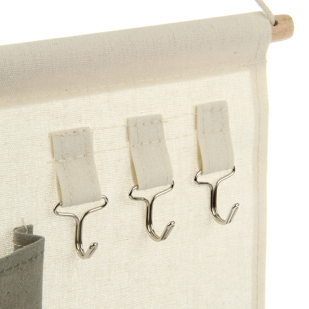 Длину веревки можно регулировать, подвес из натурального дерева. Вместительные карманы с влагостойкой пропиткой, держат форму, 3 прочных кармана. 3 металлических крючка для хранения ключей или ножниц. Красивый и удобный органайзер для хранения хозяйственных принадлежностей, косметики, пультов, гаджетов и проводов.