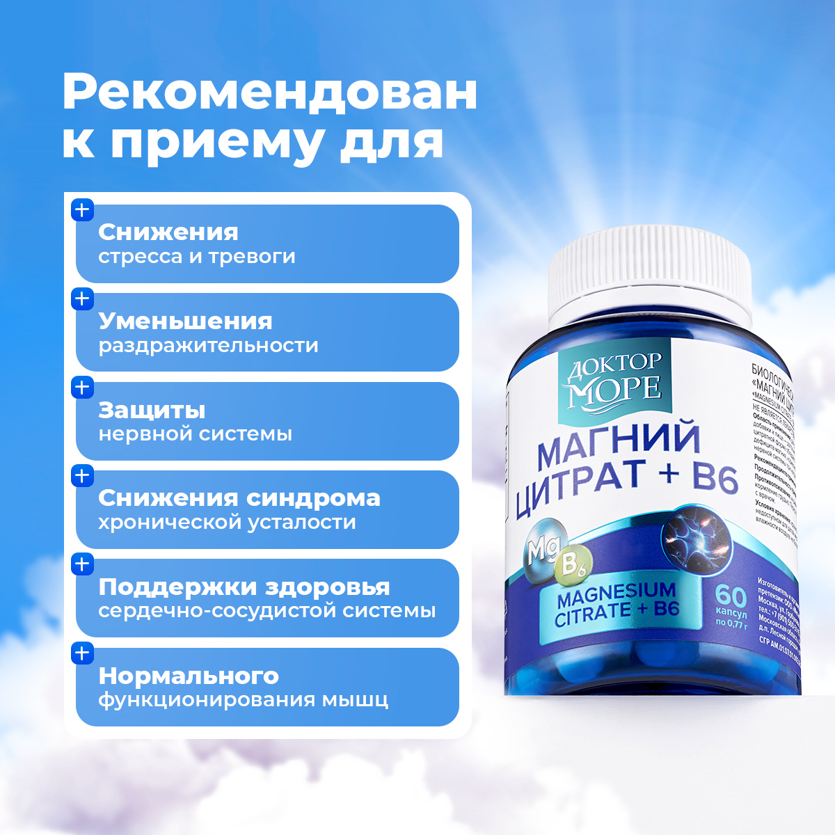 Цена на Магний цитрат + В6 Доктор Море для защиты нервной системы и поддержания спокойствия и внутреннего равновесия - 625 ₽.