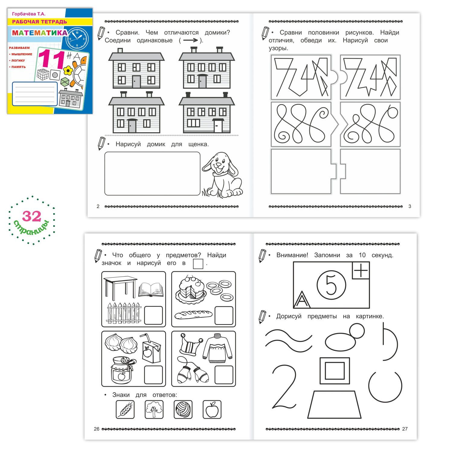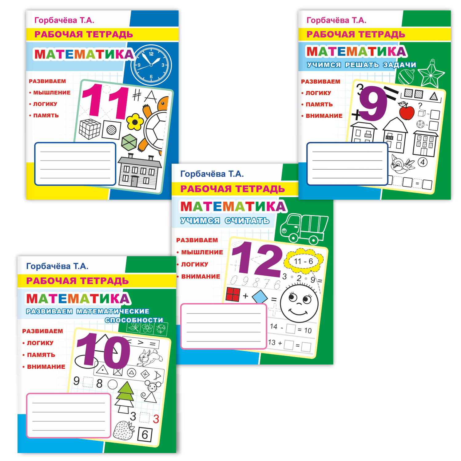 Комплект из 4 рабочих тетрадей: Математика, Математика. Учимся считать, Математика. Развиваем математические способности, Математика. Учимся решать задачи . Книги, созданные под руководством учителя высшей категории Т.А. Горбачевой - это обучающие и увлекательные пособия для Вашего ребенка. Рабочая тетрадь рассчитана на работу ребенка со взрослым, который поможет прочитать задания и начнет их выполнять. Ребенок, играя, раскрашивая и выполняя разнообразные задания, проявит свои способности и таланты, приобретет необходимые навыки и умения для успешного обучения в школе.Обучающие пособия для развития логического мышления и внимания у детей. Рабочие тетради в плотной офсетной обложке, 16,5 х 20,5см, 33 страницы.