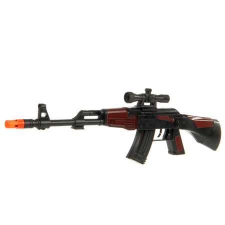 В комплекте игрушечный автомат и съемный прицел. У автомата нажимается курок, при этом оружие издает звук трещотки.