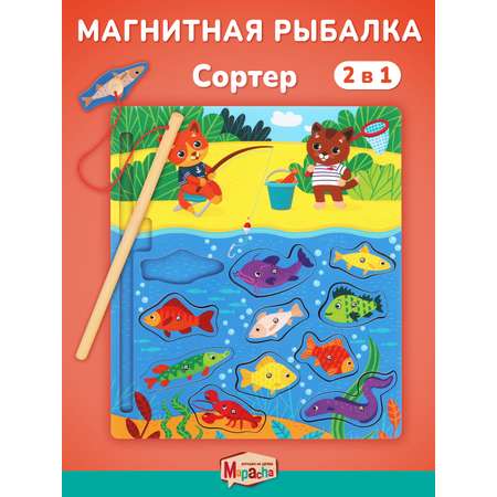 Детская магнитная игра сортер "Рыбалка" с удочкой — это увлекательный и развивающий набор, созданный для малышей. В комплект входят яркое игровое поле с изображением озера и двух котиков, 11 деревянных магнитных рыбок различных форм и цветов, а также удочка с магнитом.
