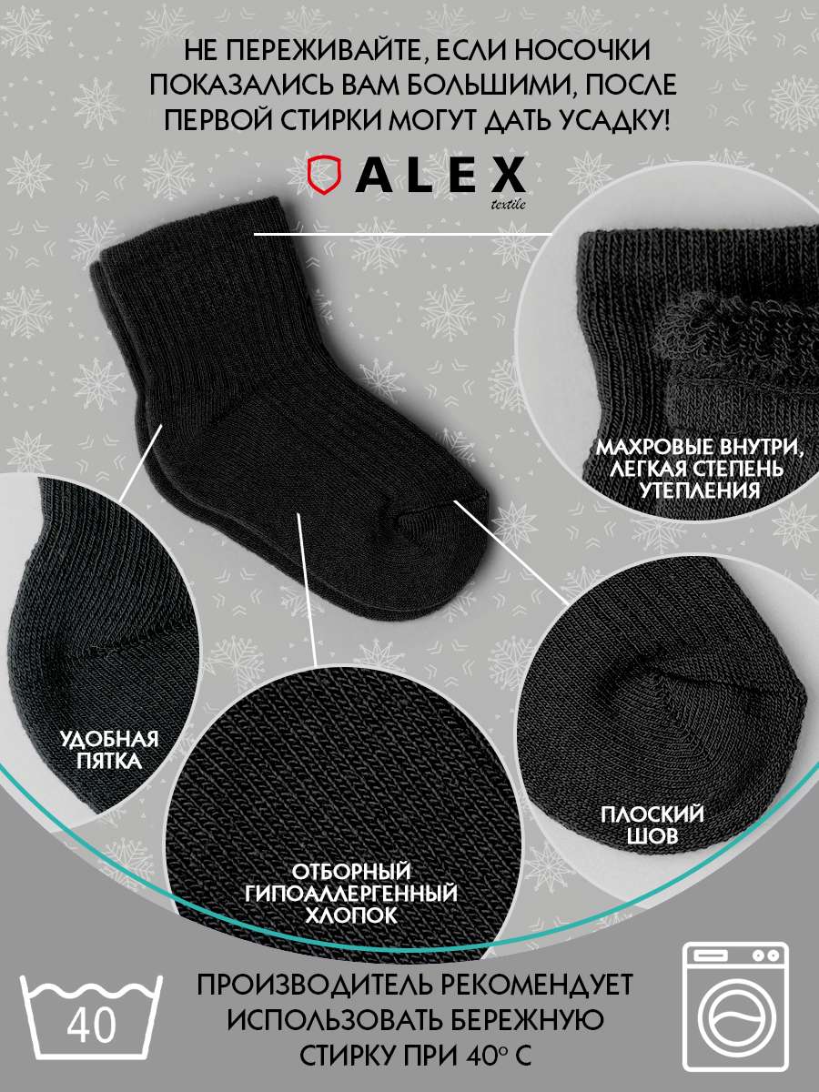 Носки детские сохраняют форму после стирки, не растягиваются и не линяют. Махровые носки для новорожденных имеют среднюю длину, что удобно для использования как дома так и на улице под первую обувь малыша. Мягкая эластичная резинка вокруг ножки не оставляет неприятных следов на коже малыша, надежно фиксируются и не сползают во время активных движений ребенка.