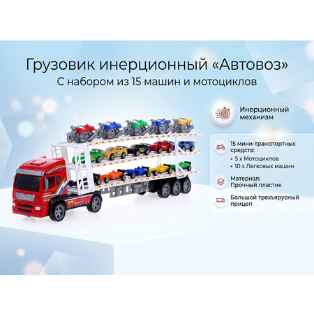 В комплекте инерционного грузовика «Автовоз» 15 машинок и мотоциклов. Игрушка подойдёт ребёнку для увлекательного досуга и развития навыков езды. Малыш сможет устроить настоящие гоночные соревнования самостоятельно или с друзьями.
