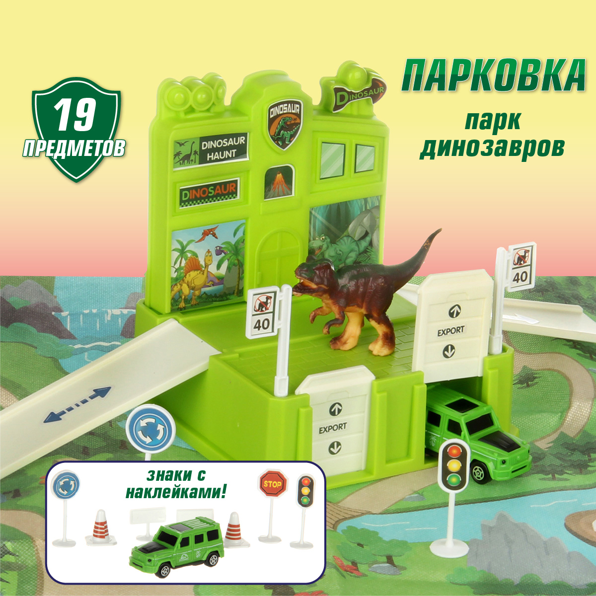 В комплекте 6 деталей для сборки парковки, 9 знаков дорожного движения, наклейки, игрушка машинка, фигурка динозавра, карта.