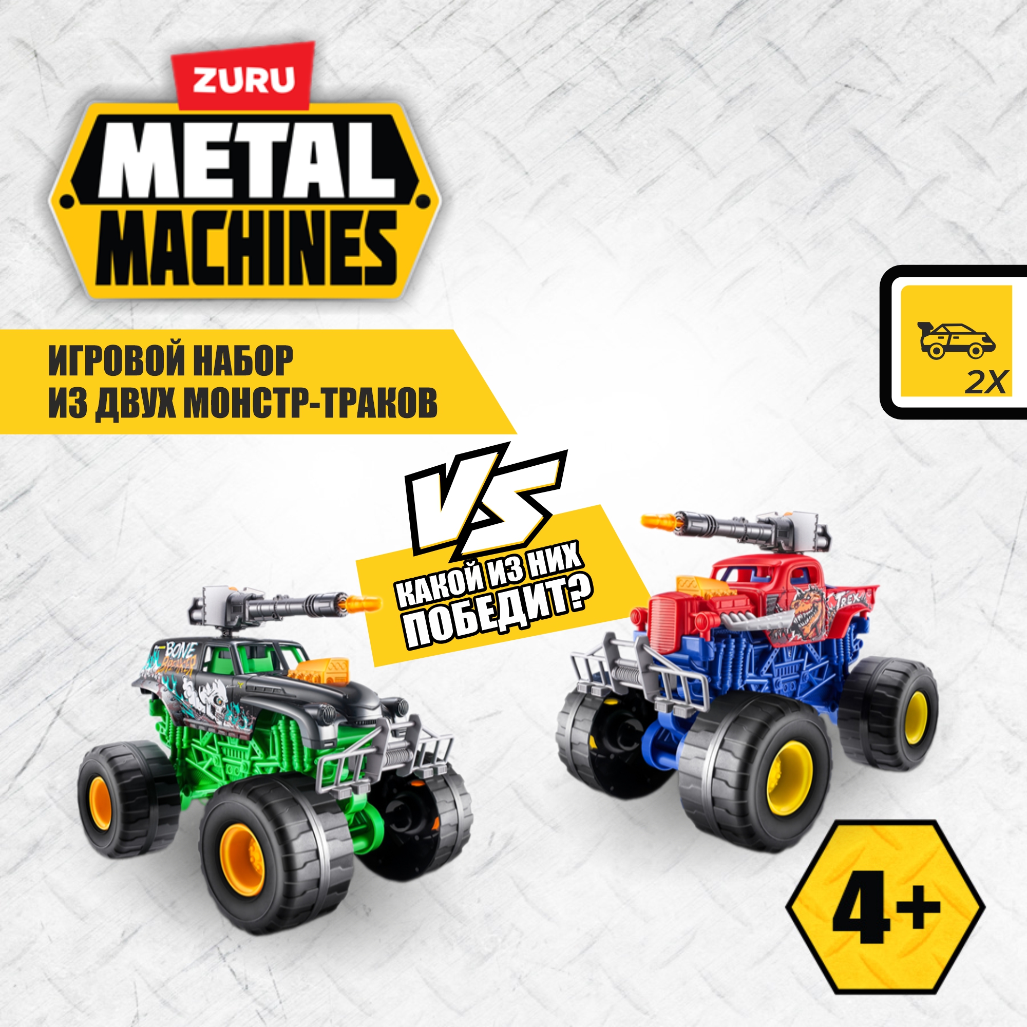 Игровой набор Metal Machines Monster Truck Wars от ZURU — это мощная игрушка для мальчика, которая включает две внедорожной машинки с подвеской нового уровня, управляемым рулём и стреляющим оружием на крыше. Огромные монстр траки легко справляются с любыми препятствиями, а световые и звуковые эффекты делают игру ещё более захватывающей. Отличный набор машинок и подарок для мальчика, который любит экшен и технику. Характеристики: