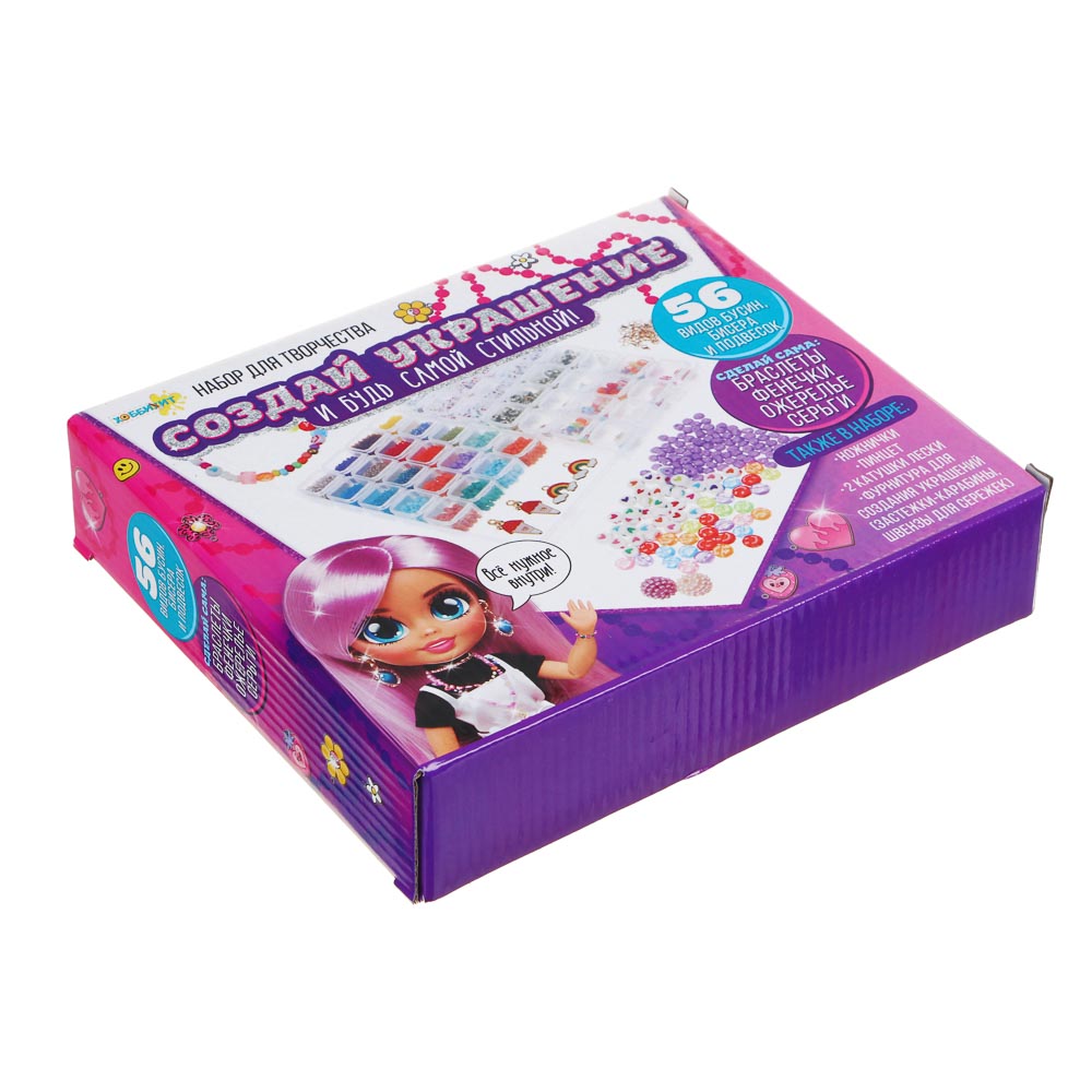 Набор для творчества и рукоделия состоит из множества цветов яркого цветного плоского бисера, бусин, застежек, колец, ракушек, подвесок, ножниц и лески для плетения.