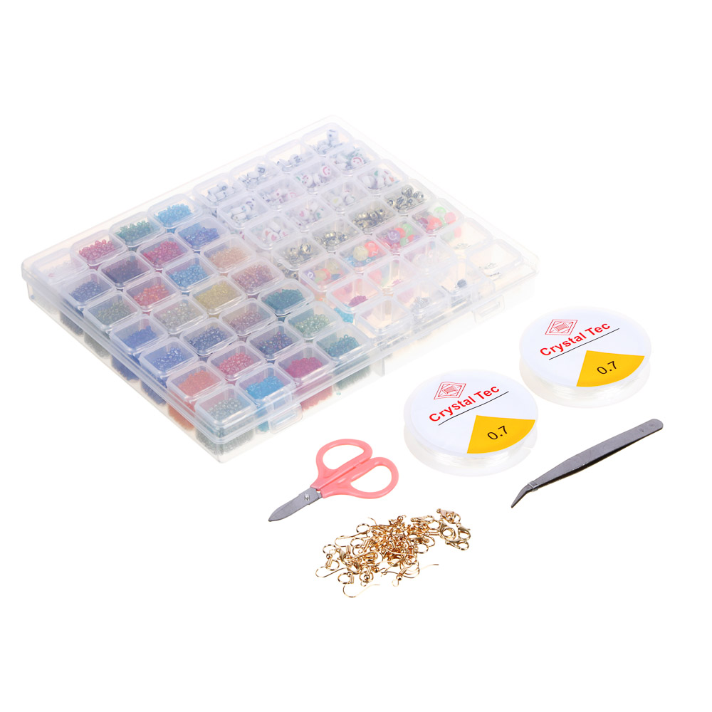 Набор упакован в пластиковый бокс, который состоит из 24 ячеек отдельно для каждого вида бисера и бусин.