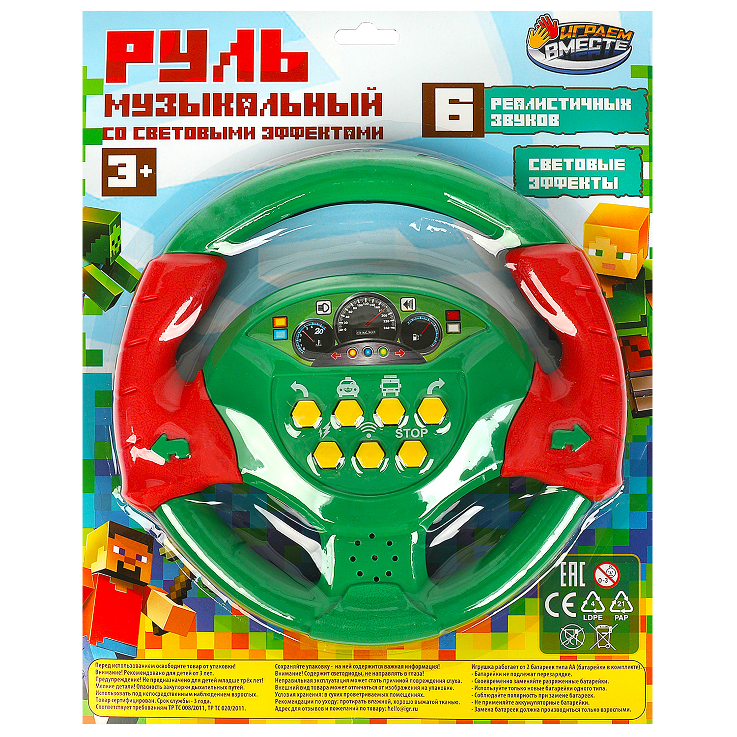 Игрушка выполнена в виде руля с кнопками. С таким рулем ребёнок сможет придумать массу игровых сюжетов, представляя себя водителем.