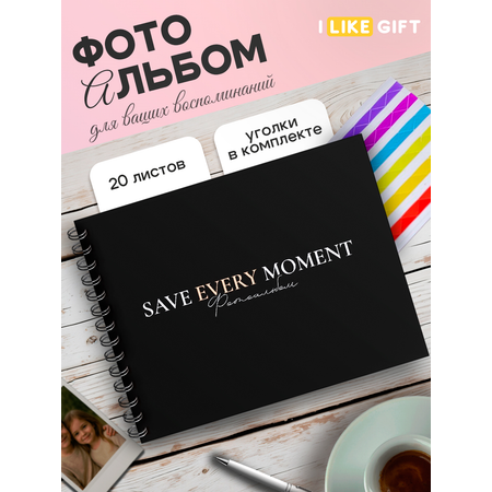 Фотоальбом iLikeGift Save Every Moment black 20 листов 24,5×19 см — стильный фотоальбом на спирали в чёрном цвете. Он про жизнь «как она есть»: дом, где всегда кто-то смеётся; тёплые вечера вместе; первые дни с малышом; моменты, которыми гордишься; маленькие победы, которые хочется запомнить, пока они ещё свежие. Это альбом, который помогает остановить время и сложить вашу историю в одно место — так, как она проживается сейчас.