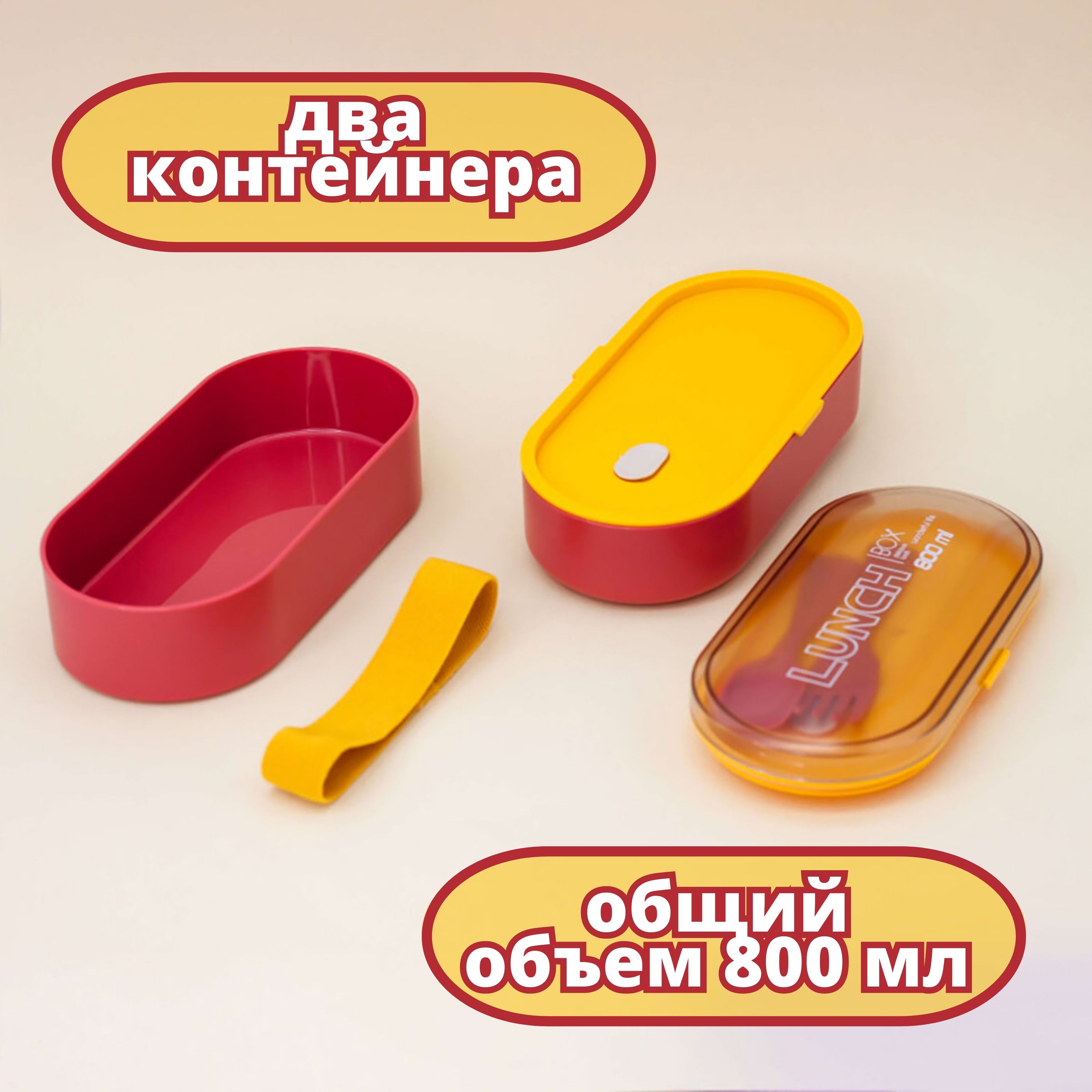 Ланч-бокс — это многоразовая посуда, которая идеально подходит для использования в школе. В контейнер можно положить обед на работу. Также ланчбокс можно взять с собой в поездку. Он компактный и легкий, поэтому с легкостью поместится в сумку. Ланч-бокс состоит из двух контейнеров. Общий объем составляет 800 мл. Размер ланч-бокса в собранном виде — 18,5 х 9,5 х 10 см. В комплекте идут ложка и вилка.
