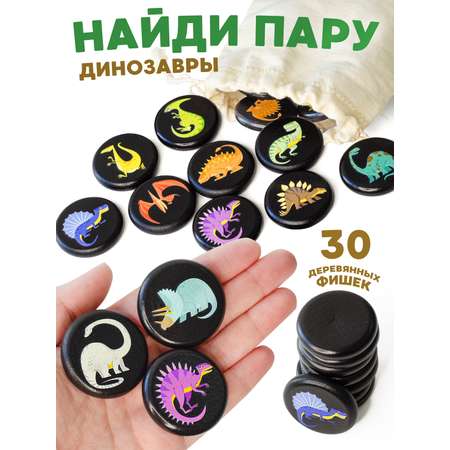 Состав: 30 деревянных фишек с парными рисунками размером 4х4 см каждая с изображением динозавров, мешочек для хранения фишек, картонная упаковка размером 13х14х8 см.