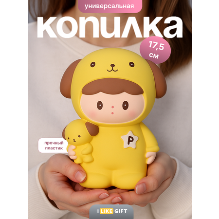 Копилка пластиковая iLikeGift Щенок — яркая, тёплая и по-настоящему милая фигурка, которая помогает ребёнку делать первые сбережения и украшает комнату. Персонаж в жёлтом «щенячьем» костюме с круглым личиком, мягкими ушками и крошечной игрушкой-щенком в руке выглядит как герой доброго мультфильма. Он сразу привлекает внимание и создаёт ощущение уюта — такая копилка отлично смотрится в детской, на столе школьника или даже в рабочем уголке взрослого, который любит позитивные детали.