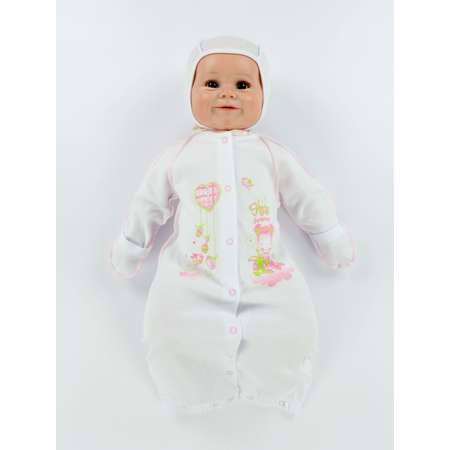 Комбинезон-конверт из интерлока. Комбинезон выполнен швами на "лицо". Рукава покроя реглан, длинные, заканчиваются отворачивающейся рукавичкой. Горловина круглая, обработана воротничком - шалкой. Застежка комбинезона-конверта центральная на кнопочки. Так же низ конверта на резинке и на кнопках. Изделие украшено печатным принтом - ангелочком.