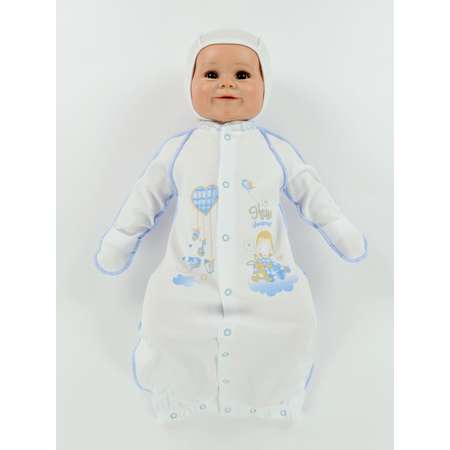 Комбинезон-конверт из интерлока. Комбинезон выполнен швами на "лицо". Рукава покроя реглан, длинные, заканчиваются отворачивающейся рукавичкой. Горловина круглая, обработана воротничком - шалкой. Застежка комбинезона-конверта центральная на кнопочки. Так же низ конверта на резинке и на кнопках. Изделие украшено печатным принтом - ангелочком.
