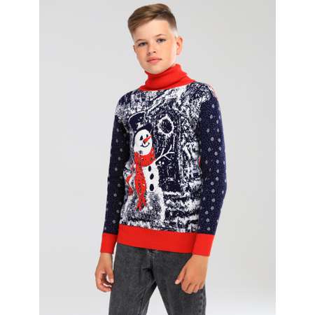 Модель выполнена из вязаного трикотажа. Детали: - высокая горловина; - длинные рукава; - гладкая вязка; - на спинке более тонкая вязка; - вязаный рисунок в виде большого снеговика.